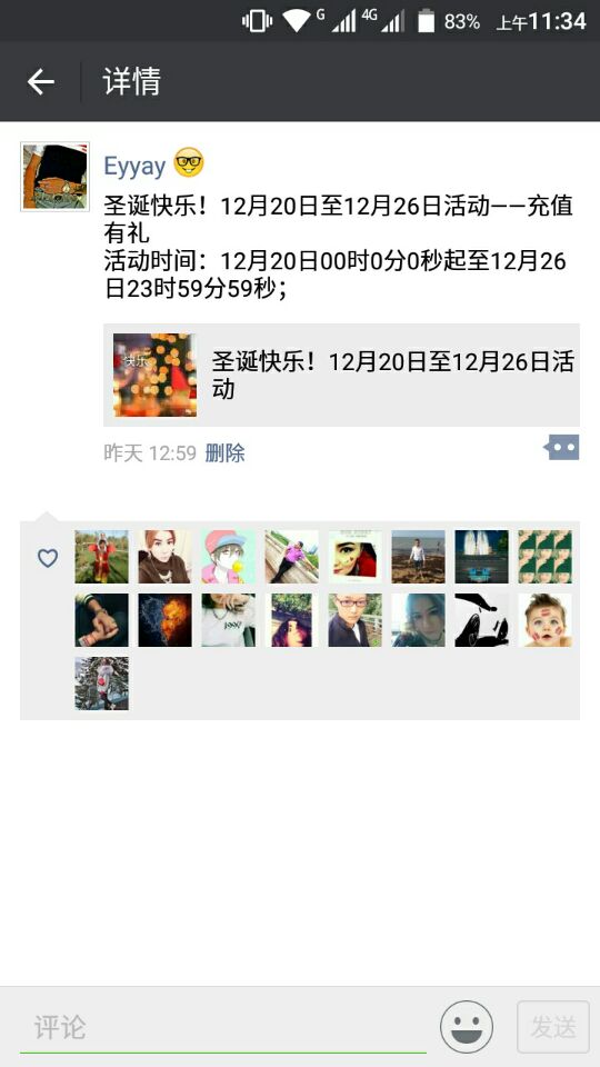 1. 关注《飚车世界》微信服务号/微信订阅号,进入公账号。回复“活动”点击“圣诞快乐12月20日至12月28日”活动和其他3个都可以,选择分享朋友圈;